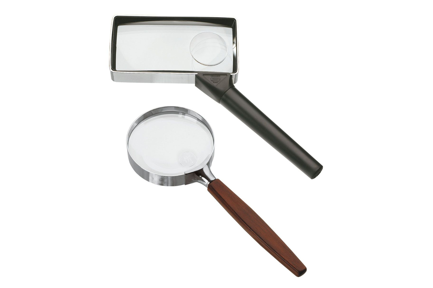 Lupă de citire cu mâner rotund din polimer negru mat și suport premium din alamă cromat. Lentilă de sticlă biconvexă și lentilă suplimentară...