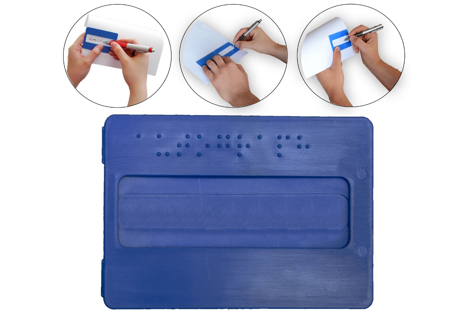 Ghid de ajutor pentru semnătură, destinat persoanelor nevăzătoare. Este ușor de folosit, durabil, asigură realizarea unei semnături și încape cu ușurintă în orice portofel.